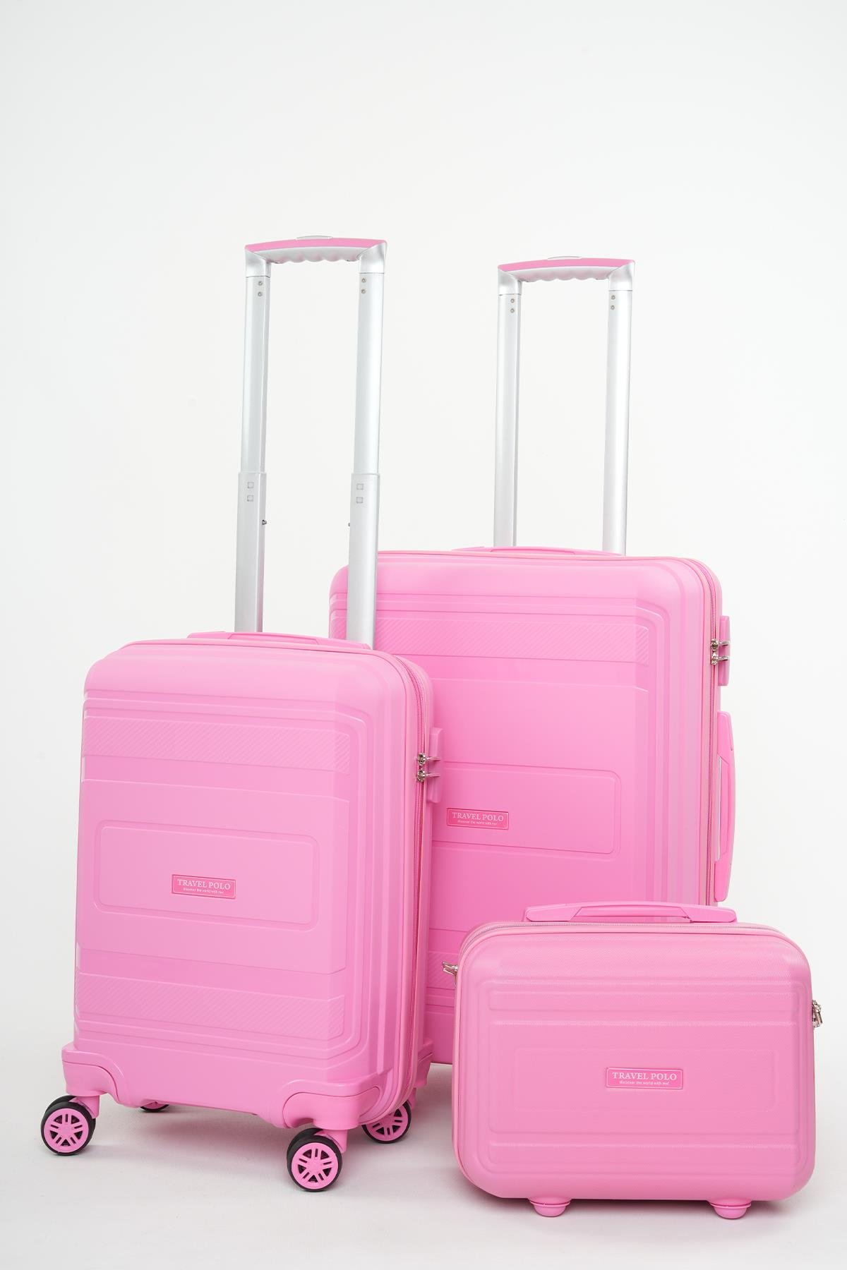 Travel Polo 3'lü Polipropilen Kırılmaz Valiz Kabin - Orta Boy ve Makyaj Fuşya 1017